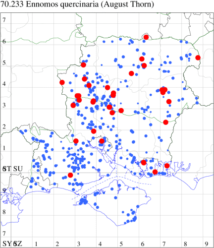 Common in broad-leaved woodland, areas with scattered trees, scrub, hedgerows, parks and gardens throughout the British Isles. Widespread and common in Hampshire and on the Isle of Wight. Wingspan 42-54 mm. Larva feeds on Pedunculate Oak, Hawthorn, Blackthorn, Hazel, Downy and Silver Birch, Elm, Sallow, Horse Chestnut, Sweet Chestnut and Beech.