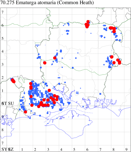 Local on heathland, open woodland, moorland and bogs throughout the British Isles. In Hampshire fairly common on the heaths of the New Forest and in the north-east, but very local elsewhere. Not recorded from the Isle of Wight since 1948. Wingspan 36-41 mm. The most likely confusion species is Common Heath Ematurga atomaria, especially pale forms. Larva feeds on Heather, Bell Heather, Broom and Petty Whin.