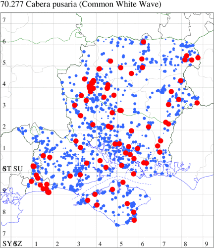 Common in broad-leaved, often damp, woodland throughout much of the British Isles; frequently recorded and well distributed across Hampshire and the Isle of Wight. Wingspan 30-35 mm. The main confusion species is Common White Wave C. pusaria, in which the cross-lines are straight and grey. Larva feeds on Goat Willow, Grey Willow, Aspen and Poplar, over-wintering as a pupa.