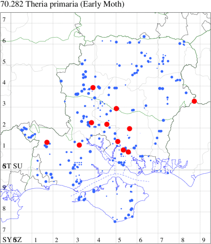 Common in open woodland, woodland edges, scrub and mature hedgerows throughout England, Wales and southern Scotland. In Hampshire and on the Isle of Wight common to abundant in late winter amongst hawthorn in open country and on the downs. Wingspan male 32-37 mm, female wingless. Males could be confused with Sloe Carpet Aleucis distinctata, but Early Moth has straighter distal edge of central band and females have band on vestigial wings. The flightless females may be found sitting on the leafless twigs after dark. Larva feeds on Blackthorn, Hawthorn and Midland Hawthorn.