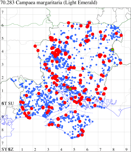 Common wherever there are coniferous trees throughout the British Isles. Widespread and fairly common in Hampshire and on the Isle of Wight. Wingspan 32-44 mm. Occasional green individuals of the form f. prasinaria, which can be confused with Light Emerald Campaea margaritata, are reported. Larva feeds on various coniferous trees, including Scots Pine, Norway Spruce and European Larch.
