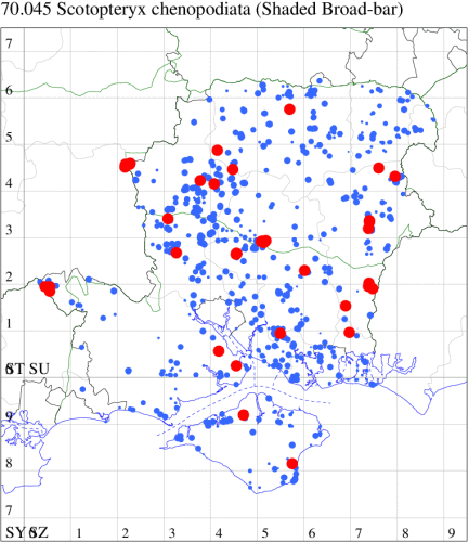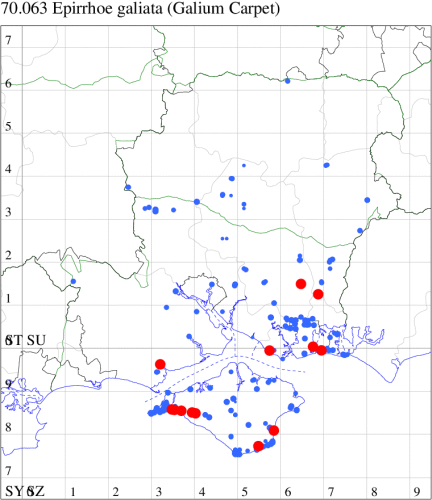 Local in fens, water meadows, damp woodland, marshes and river-banks throughout much of the British Isles, a species of conservation concern under the UK Biodiversity Action Plan. In Hampshire and on the Isle of Wight an uncommon marsh-inhabiting species, records of which are scattered thinly across the three vice-counties. Wingspan 24-27 mm. The most likely confusion species is Oblique Striped Phibalapteryx virgata, which see for differences. Larva feeds on Marsh Bedstraw and Heath Bedstraw.