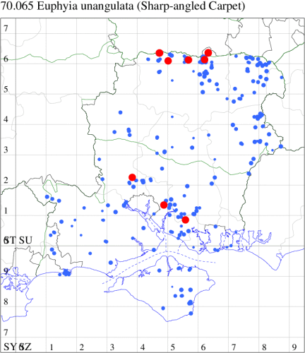 Uncommon, in damp grassland, water meadows, marshes, river-banks and damp areas in parts of southern England and south-eastern England. In Hampshire first reported at Wherwell in 1964, and now established in the upper valley of the River Test in damp woodland containing the larval foodplant, and also beginning to appear in the Itchen Valley. The only report from the Isle of Wight was back in 1999. Wingspan 27-30 mm. Occurs in two forms, a pale spring generation and a darker summer generation, the former most recalls Sharp-angled Carpet Euphyia unangulata and Wood Carpet Epirrhoe rivata. Larva feeds on Orange Balsam, over-wintering as a pupa.
