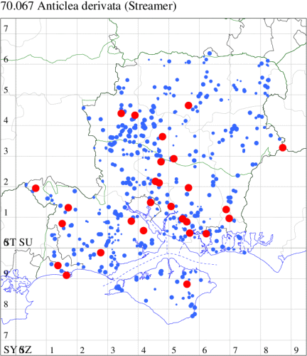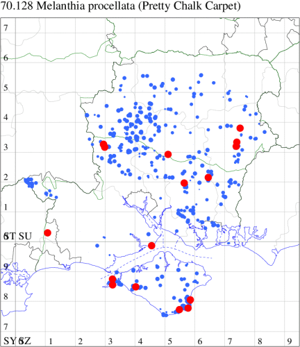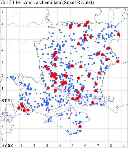 VC12: Earliest: North Waltham, 13 Apr, 1 (AJon) Latest: Windmill Hill, Chalton, 23 Oct, 1 (CJP) Max count: Stockbridge Down, 06 Aug, 8 (HVau)