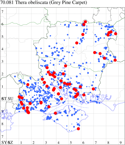 For the maps, all records prior to 2024 are shown by a blue dot (the larger the dot, the more recent), with the current year's records shown in red. As previous records are superimposed on any report for 2024, new sites have greater emphasis (i.e. will show as 'more red').