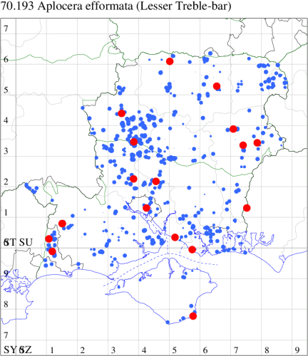 Common throughout much of southern Britain; widely distributed and fairly common in Hampshire and on the Isle of Wight: distribution of accepted records indicates that efformata is more likely in calcareous habitats than plagiata: the present species appears to be comparatively scarce on the Isle of Wight but it is unclear whether this is a true reflection of status. Wingspan 35-41 mm. The main confusion species is Treble-bar A. plagiata, but innermost fascia usually more sharply angled in A. efformata. The most reliable separating characteristic on males is that plagiata has elongated, pointed claspers giving rise to a narrow abdomen tip: efformata has a blunter tip to the abdomen with rather shorter, curved claspers. Larva feeds on St John's-worts Hypericum sp.