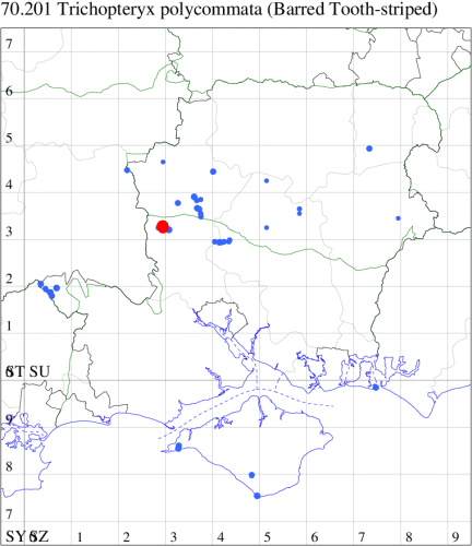 Common in broad-leaved woodland, scrubby heathland and fens throughout the British Isles. Widespread and common in Hampshire and on the Isle of Wight. Wingspan 30-34 mm. A distinctive early spring geometer, perhaps confusable only with Seraphim Lobophora halterata, but Early Tooth-striped is larger and greyer, with cross-lines weaker. Larva feeds on Sallow, Silver and Downy Birch, Honeysuckle and Alder, over-wintering as a pupa.