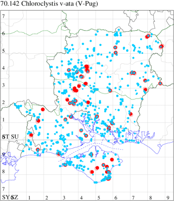 Common in gardens, allotments, hedgerows and open woodland throughout the British Isles. In Hampshire and on the Isle of Wight recorded in small numbers throughout, but easily overlooked. Wingspan 17-22 mm. The main confusion species is Wormwood Pug E. absinthiata, which is larger, with more distinct markings. Larva feeds on Hop, Black Currant and Red Currant, over-wintering as a pupa.