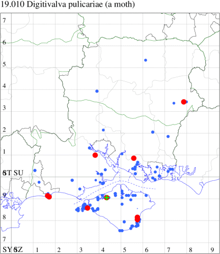 VC10: Freshwater Bay, one, 12 Jul (SDav); Walter's Copse, Newtown, larva, present, field obs., mines, including larvae, on Pulicarae dysenterica. Mine a whitish blotch, 26 Jun (PBard); Shanklin, two, 30 Jul; one, 26 Jun; 12, 17 Jul; two, 23 Jul; three, 29 Jul (IOu);