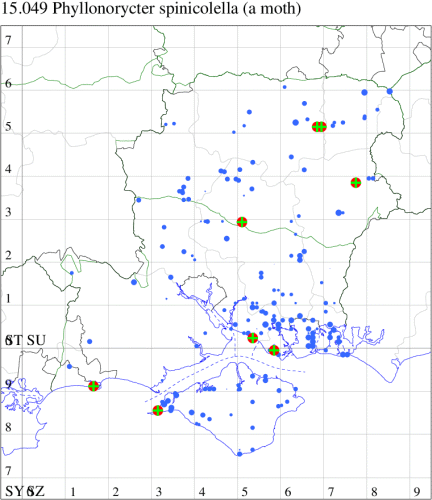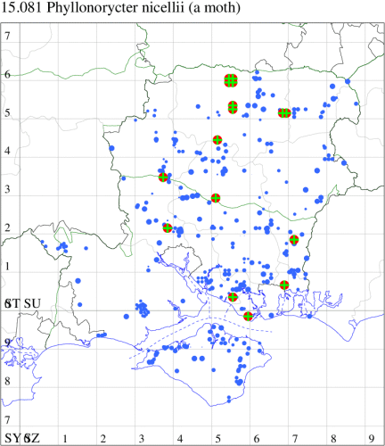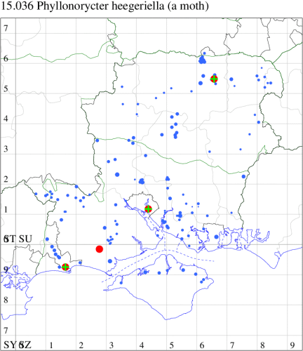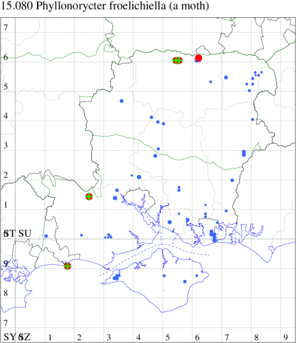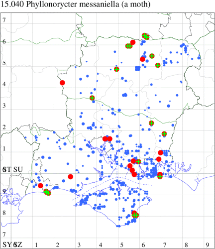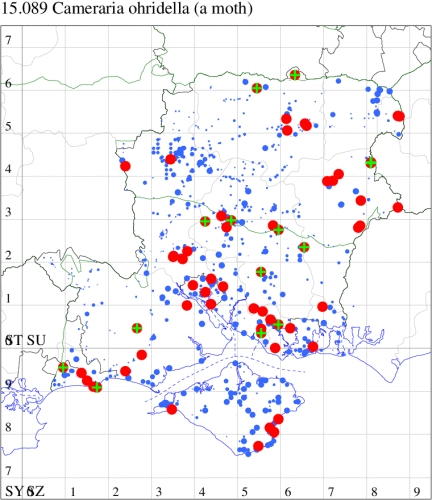 For the maps, all records prior to 2024 are shown by a blue dot (the larger the dot, the more recent), with the current year's records shown in red. As previous records are superimposed on any report for 2024, new sites have greater emphasis (i.e. will show as 'more red').