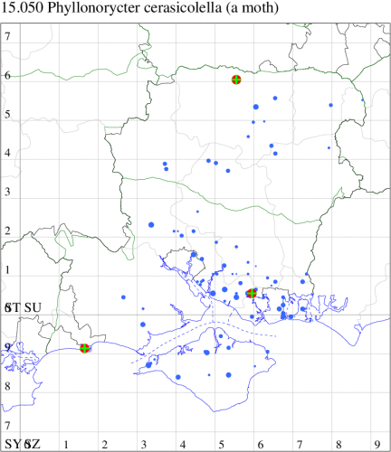 Common in hedgerows and scrubland throughout much of the British Isles, as far north as Perthshire. In Hampshire and on the Isle of Wight widespread and common especially in the south-east, but largely absent from the New Forest. Wingspan 6.5-7.5 mm. Similar to P. cerasicolella, from which separated only by dissection of the genitalia. Imago rarely recorded at light, and more frequently recorded in the larval stage, when mines are relatively easy to find where they are present. Larva mines leaves of Blackthorn and Wild Plum.