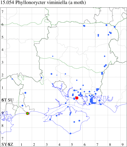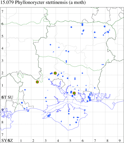 Common in damp woodland throughout much of England and Wales, and parts of western Scotland. Probably under-recorded in Hampshire or on the Isle of Wight, where the extent of known records correlate with those areas in which the recording effort is concentrated. Wingspan 6.5-7.5 mm. Imago similar to P. tristrigella, P. froelichiella, P. nicellii and P. kleemannella, but the only one of the group to have a blackish brown vertical tuft on the head. P. stettinensis may also be distinguished by its short basal streak; P. tristrigella usually has a pale basal spot, but the other species no indication even of this (MBGBI Vol 2). Imago seldom encountered at light, and more likely to be recorded in the larval stage, when mines are relatively easy to find where they are present. Larva mines leaves of Alder, over-wintering as a pupa in a cocoon.