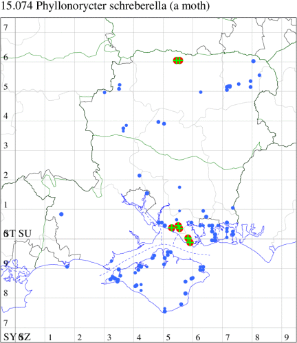 Scarce in damp woodland throughout England. Wingspan 8 mm. Larva mines leaves of White Poplar and Grey Poplar, often favouring isolated, young saplings. In Hampshire first identified as a mine on poplar leaves at Butterwood near Hook, VC12 in 2007 (also reported from the Hants/Surrey border in 2021); subsequently found to be locally common in the Portsmouth area with records from 2019 to date. Not recorded from the Isle of Wight to date.