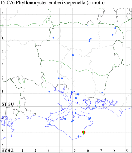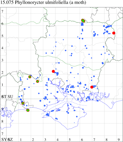 VC11: Thatchers Copse, Brownwich, mine, one, on Elm, 04 Aug; Ranvilles Lane, Fareham, mine, one, 29 Jun; Stubbington, mine, eight, on Elm, 06 Oct; mine, seven, on Elm, 06 Oct; Alver Valley CP, mine, three, on Elm, 13 Oct (DPH); Cams Bay, Fareham, mine, present, 08 Sep (AMD); Hengistbury Head, mine, present, 06 Oct; Hengistbury Head NNR, mine, present, several on elm re-growth, 31 Oct (MJef); Stokes Bay, mine, seven, on Elm, 04 Oct (DPH);