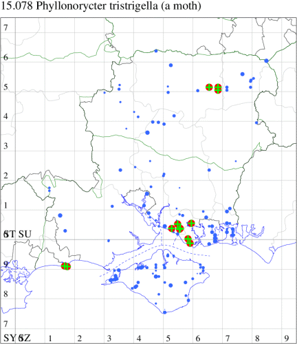 Common in damp woodland throughout much of Britain, but in Ireland known only from the Burren. Probably under-recorded in Hampshire and on the Isle of Wight, where the extent of known records correlate with those areas in which the recording effort is concentrated. Wingspan 9-10 mm. Imago similar to P. stettinensis, P. tristrigella, P. nicellii and P. kleemannella, but is by far the largest species in the group, its copper-brown ground colour is characteristic, it has the narrowest and most sharply defined black edging to the white markings and the first pair of strigulae are smoothly curved distad with their apices almost touching to form an acute- or right-angled chevron (MBGBI Vol 2). Imago seldom encountered at light, and more likely to be recorded in the larval stage, when mines are relatively easy to find where they are present. Larva mines leaves of Alder, over-wintering as a pupa in a cocoon.