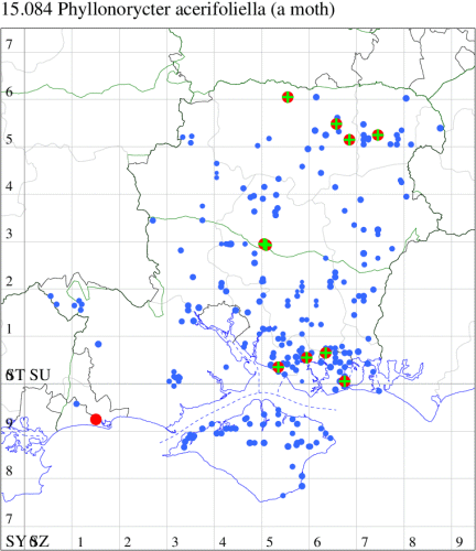 VC11: Titchfield Haven NNR, mine, one, on Field Maple, 25 Aug (DPH); Cams Bay, Fareham, mine, present, 08 Sep (AMD); Portsdown, mine, two, on Field Maple, 05 Oct (DPH); Milton Common, mine, three, on field maple, one with pupal exuvium protruding, 02 Jul (RJD); Christchurch, one, 19 Jul (APard);