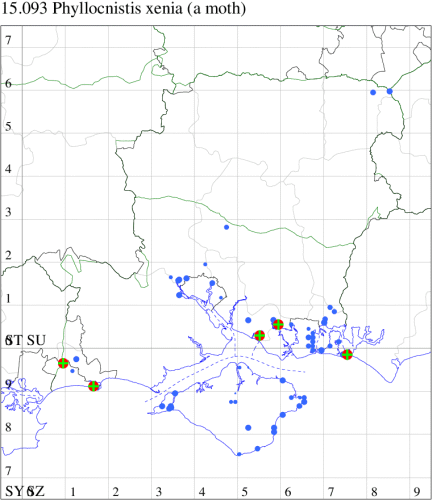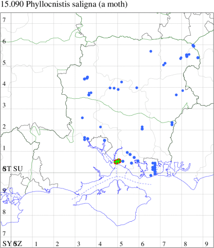 Local in fens, marshes, river-banks and other damp areas throughout southern England. In Hampshire known only from a handful of sites, including Fleet, Greywell Moors, Southsea and Leckford, but perhaps under-recorded. Not recorded from the Isle of Wight to date. Wingspan 6-7 mm. The imago can be separated from other Phyllocnistis only by dissection of the genitalia (females only, males are indistinguishable). Larva mines leaves of Purple Willow Salix purpurea. See the leafmines.co.uk newsletter that describes the mines of the four species in the complex.
