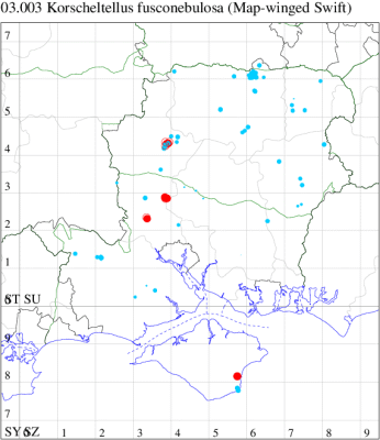 Local in grassland throughout most of the British Isles. In Hampshire locally common wherever there is bracken, rather uncommon on the Isle of Wight. The males sometimes swarm just before dusk over grassy places adjacent to stands of foodplant. Wingspan male 26-30 mm, female 28-32 mm. The golden markings on forewing of male are diagnostic; in particular, the diagonal, sometimes broken band near base runs roughly parallel to outer markings, unlike other swift moths (MBGBI Vol 1). Larva feeds within roots of Bracken, over-wintering twice.