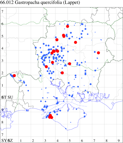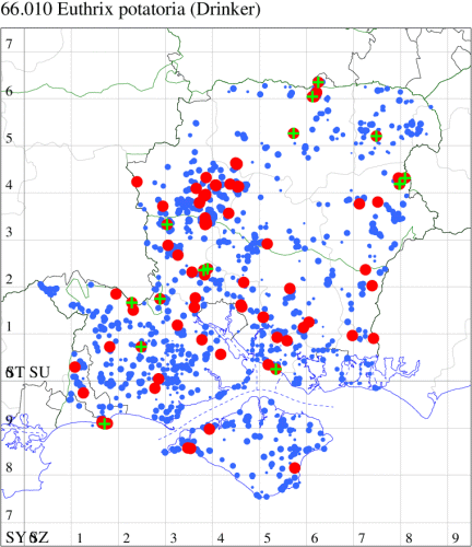 For the maps, all records prior to 2024 are shown by a blue dot (the larger the dot, the more recent), with the current year's records shown in red. As previous records are superimposed on any report for 2024, new sites have greater emphasis (i.e. will show as 'more red').