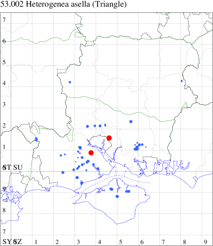 VC11: Brockwood, one, 21 Jun (SDut); Marchwood, one, 01 Jul (TDCh); one, 11 Jul; one, 16 Jul; one, 18 Jul (CTha); Woodlands, NF, one, 24 Jun (RBW); Cromarty Pond area, Lord's Hill, one, 09 Jul; one, field obs., 10 Jul; larva, one, field obs., 18 Sep (JClx); Mottisfont Abbey NT, nr Romsey, one, 12 Jul (TSto); Romsey, one, 20 Jun; one, 03 Jul (NRJ); Dibden Purlieu, one, 25 May; one, 09 Jul; Dibden Purlieu, NF, one, 11 Jul; one, 11 Jul; one, 12 Jul (RAC); Blackfield, four, 25 Jun (SJJ); Allbrook, one, 24 Jun; two, 26 Jun; one, 10 Jul; one, 11 Jul; Highbridge, Eastleigh, five, 25 Jun (SIng); Stubbington, one, 25 Jun (DPH); Funtley, four, 25 Jun; two, 26 Jun; two, 29 Jun; two, 11 Jul; one, 13 Jul; one, 19 Jul; one, 20 Jul (TDC); Fareham, one, 01 Jul (ADT); one, 29 Jun; one, 10 Jul; two, 17 Jul (MLO); Pigeon House Coppice, Boarhunt, one, 12 Jul (F.M.G.); Botley, one, 23 Jun (SLB); Wickham, two, 25 Jun; one, 26 Jun; one, 30 Jul (JRDS); Upham, one, 15 Jun (F.M.G. det. RJD); Waterlooville, one, 25 Jun; one, 30 Jun; one, 04 Jul; seven, 07 Jul; three, 10 Jul; one, 15 Jul; one, 17 Jul; one, 11 Aug (DWhe); South Holt Farm, NF, one, 12 Jul (CGree det. OHen); Muscliffe, one, 19 Jul (CMur det. CMur,MLan); Merritown Heath, one, 29 Jun (DFoo); Burton, nr Christchurch, one, 15 Jun (JStw); Stanpit Marsh LNR, one, 22 Jun (PAB); Hengistbury Head, one, 26 Jun (MJef); St Georges Drive, Bransgore, two, 29 Jun (SPMC); New Milton, two, 23 Jun (RPH); Sway, one, 03 Jun; two, 24 Jun; one, 09 Jul; one, 11 Jul; two, 31 Jul (SKee); Sway, NF, two, 23 Jun (DMui);