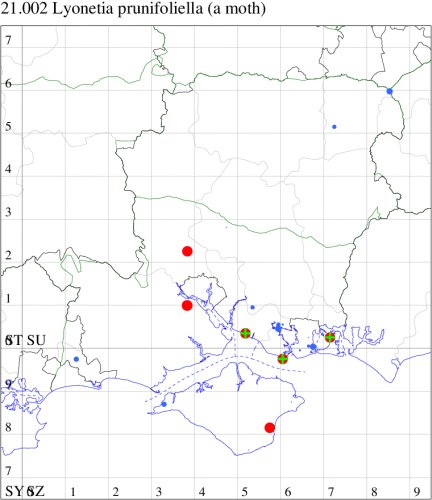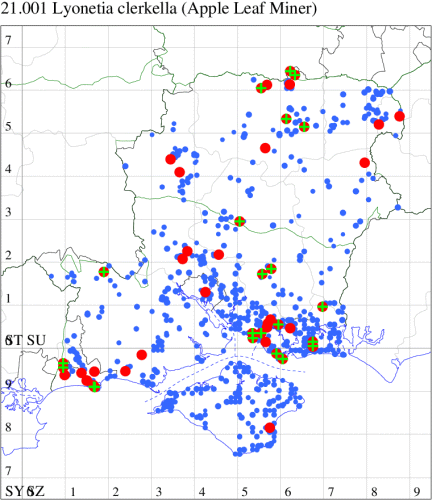 VC11: Marchwood, one, 14 Jul; one, 28 Aug; one, 01 Sep (CTha); Romsey, one, 11 Jun (NRJ); Brownwich, mine, one, on Blackthorn. 3 mines, probably all created by a single larva, 04 Aug (DPH); Hayling Billy, mine, present, 19 Aug (AMD); Gilkicker, Gosport, mine, 20, on Blackthorn, 10 Aug (DPH)