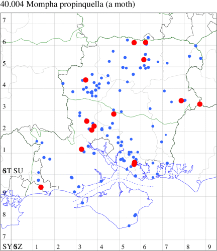 VC11: Marchwood, one, indoors, 16 Feb (TDCh); Mottisfont, present, 01 Jun (TSto); Southampton, one, 16 Aug (MGP); Fareham, one, 23 Jun (ADT); Portsmouth, one, 23 May (IRT); Waterlooville, one, 25 Jun (DWhe); Christchurch: Cross Way, one, 07 Jun; one, 16 Jun; one, 29 Jun (LPyk); Tuckton, Christchurch, one, 17 Jun (APard);