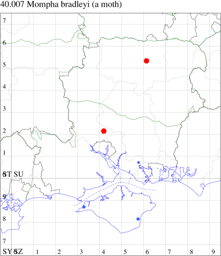 Nationally scarce (Na) in damp woodland, waste ground, open areas and damp shady places in parts of southern Wales and southern England, with records north to Cumbria. In our area it was for a long time restricted to the area of vice-county 11 around Christchurch in Dorset, but in recent years - whether through increased observer interest or genuine increase in range - has spread to a number of localities along the south coast. There is one isolated record in the north of Hampshire. First recorded on the Isle of Wight at Freshwater in 2011, where it is now annual. Wingspan 10-13 mm. Superficially similar to M. bradleyi, but white dorsal streak at base of forewing less strongly irrorate with darker scales and thorax light brown with only anterior edge dark greyish brown (MBGBI Vol 4 part 1). Larva mines stems of Broad-leaved Willowherb, Marsh Willowherb and Hoary Willowherb, forming galls.