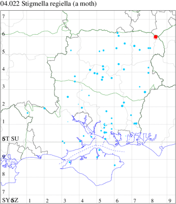 Local throughout much of England, as far north as Durham. In Hampshire very rare away from the extreme south-east of the county; on the Isle of Wight, common and widespread. Wingspan 4.8-5.6 mm. Larva mines leaves of Elm, over-wintering as a pupa.