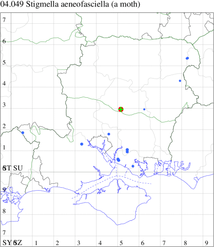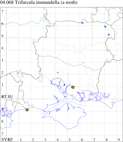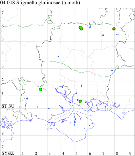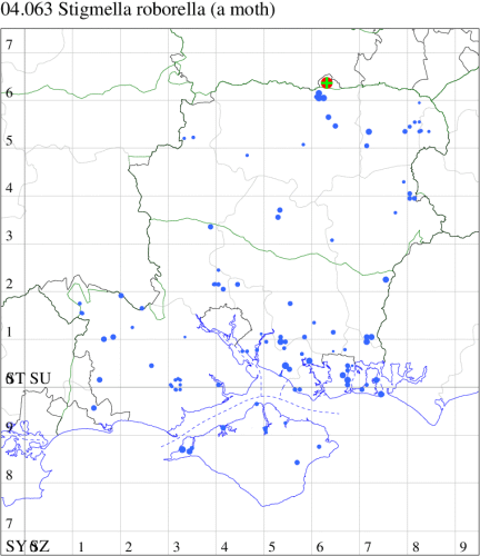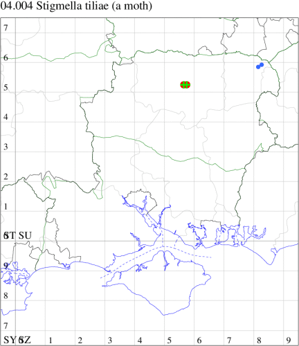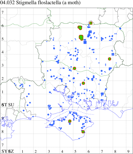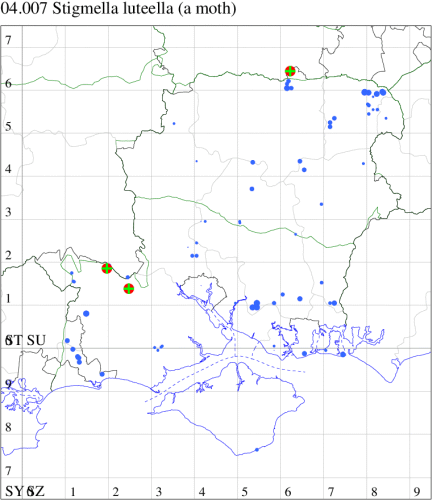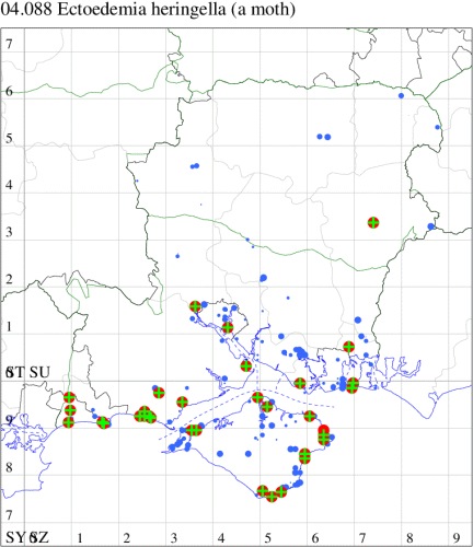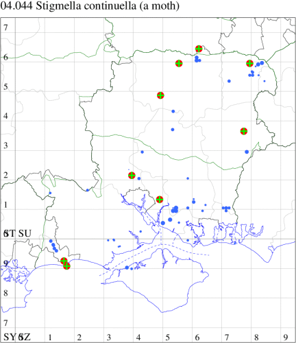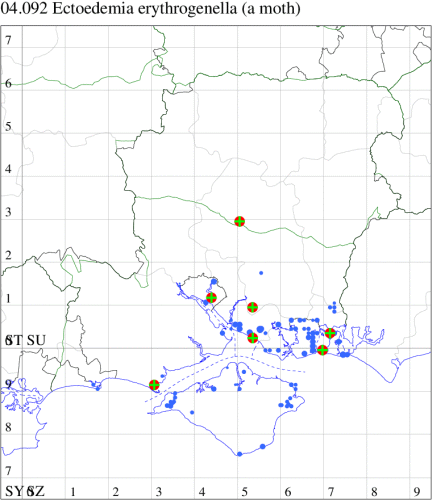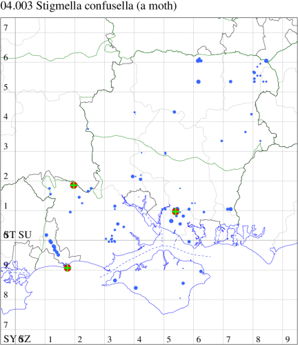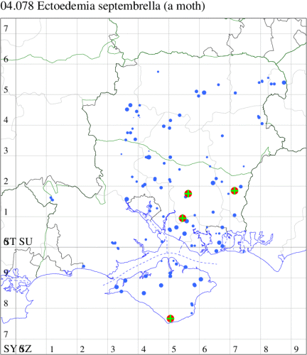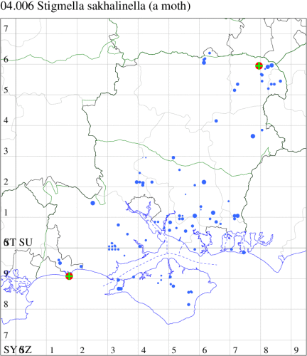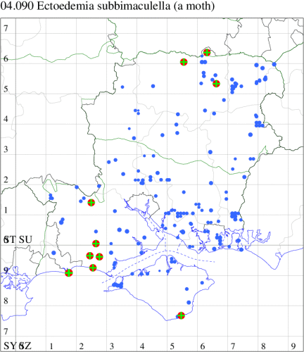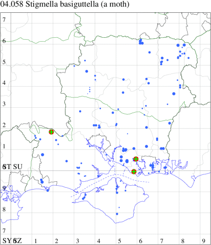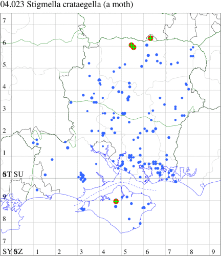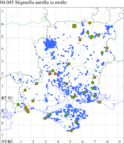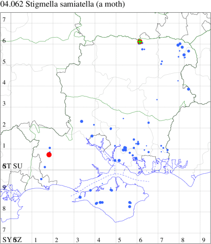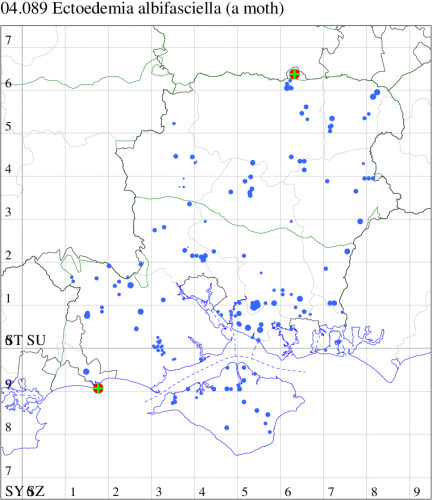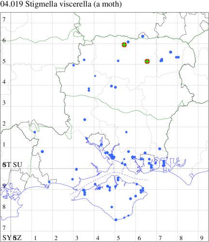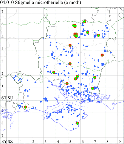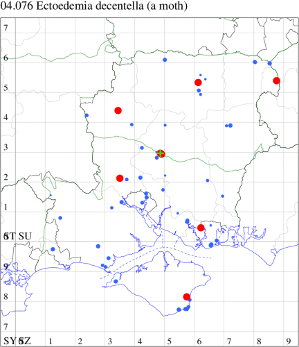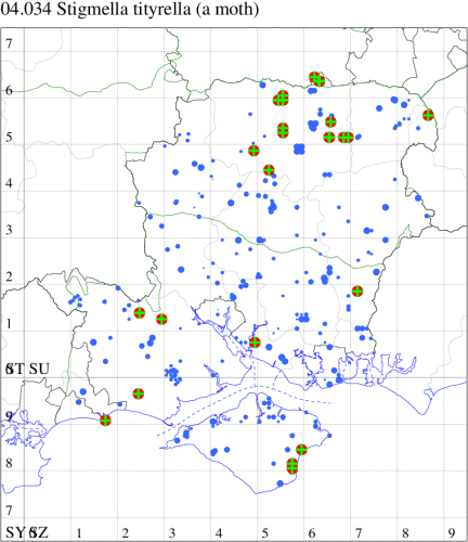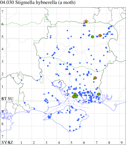 For the maps, all records prior to 2024 are shown by a blue dot (the larger the dot, the more recent), with the current year's records shown in red. As previous records are superimposed on any report for 2024, new sites have greater emphasis (i.e. will show as 'more red').