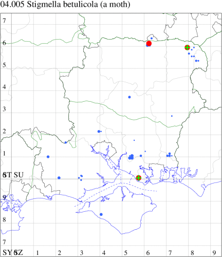 Common throughout much of Britain and western Ireland. In Hampshire and on the Isle of Wight mines are fairly common in all three vice-counties, notably at Botley Wood and Royston Woods HWT reserve in the south and around Fleet in the north. Wingspan 5-7 mm. Adults require dissection to distinguish from other Stigmella species, and more reliably recorded in the larval stage, which mines leaves of Birch, over-wintering as a pupa. The mines are described in the following link: