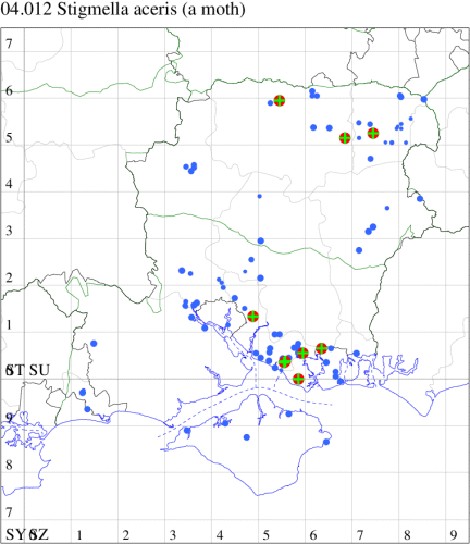 Local in woodland, gardens and parkland from Kent to Hampshire. First recorded in our area from Teg Down, Winchester, in 1986, it was not found again until 2004 in the Fleet area, where the centre of population in north Hampshire still lies. The last decade has seen an increase in records and it is now frequently recorded around the Southampton area; first recorded from the Isle of Wight in 2020, where further expansion is likely. Wingspan 3.7-4.7 mm. Best recorded in the larval stage, when mines can be found in the leaves of Field Maple, sometimes Norway Maple, over-wintering as a pupa. The mines are described in the following link: