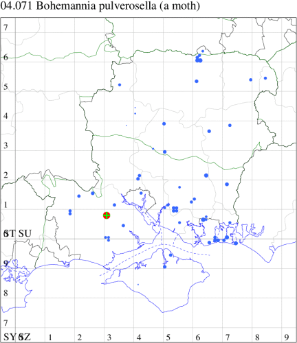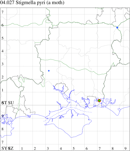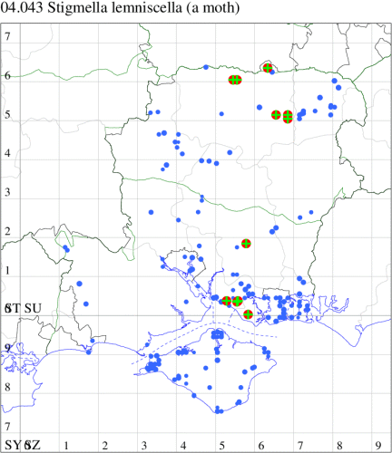 Local throughout much of England, as far north as Durham. In Hampshire very rare away from the extreme south-east of the county; on the Isle of Wight, common and widespread. Wingspan 4.8-5.6 mm. Larva mines leaves of Elm, over-wintering as a pupa.