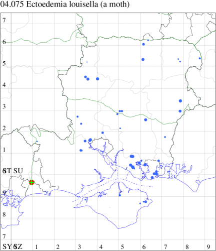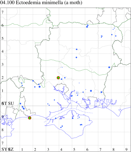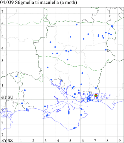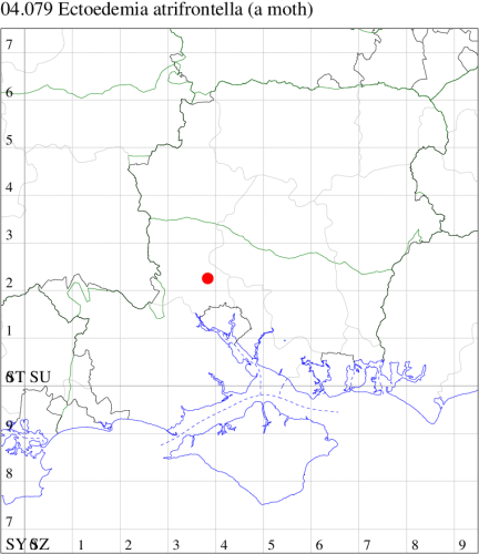 Local in woodland throughout south-eastern England. In Hampshire widely, but thinly, distributed across most of the county, but remaining extremely rare on the Isle of Wight. Wingspan male 4.2-5.0 mm, female 4.6-5.6 mm. Easily separated from all other Ectoedemia species by characteristic pattern of three white spots on forewing: a costal, a dorsal and a discal spot (MBGBI Vol 1). Larva mines leaves of Pedunculate Oak, often in fallen leaves, over-wintering as a pupa.