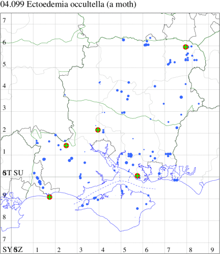 VC11: Set Thorns Inclosure, NF, vacated mine, one, 23 Dec (SKee); Fritham, NF, mine, present, quercus, 13 Oct; Hengistbury Head NNR, mine, present, quercus, slit in underside of mine, 27 Oct (JOug); mine, present, many mines on English Oak, 15 Oct (MJef); New Milton, mine, present, conf RE, 21 Oct; Barton Golf Course, vacated mine, two, 02 Nov; Hordle, mine, present, conf RE, 25 Oct (SKee);