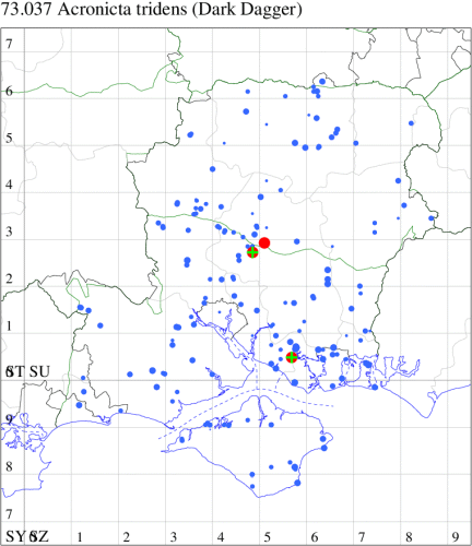 Common in woodland, hedgerows, gardens, scrubby heathland, calcareous grassland, fens and a wide range of other habitats; low altitudes in the north throughout much of the British Isles, a species of conservation concern under the UK Biodiversity Action Plan. In Hampshire and on the Isle of Wight very much more common than Dark Dagger, but undoubtedly under-recorded. Wingspan 33-44 mm. Very similar to Dark Dagger A. tridens, from which separated only by dissection of the genitalia. The larvae of the two species are readily identifiable. Larva feeds on various broad-leaved trees and shrubs, including Blackthorn, Hawthorn, Apple, Birch, Common Lime, English Elm and Rowan, over-wintering as a pupa.
