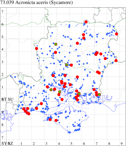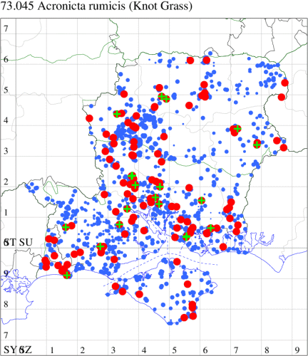 Common on grassland, heathland, marshes, gardens and a wide range of other habitats throughout much of the British Isles. In Hampshire and on the Isle of Wight widespread and common in all three vice-counties. Wingspan 35-43 mm. Superficially similar to other Acronicta species, it can usually be distinguished by the curved white mark near the rear edge of the forewing, which is normally present even in melanic specimens. Larva feeds on various herbaceous and woody plants, including Broad-leaved Dock, Common Sorrel, Ribwort Plantain, Greater Plantain, Water Mint, Bramble, Hop, Hawthorn and Burnet Rose, over-wintering as a pupa.