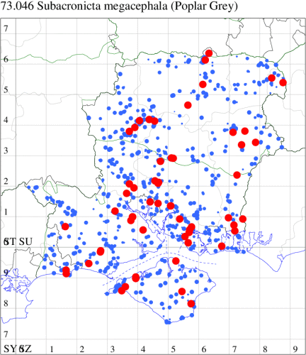 Local in a wide variety of habitats, including hedgerows, woodland, calcareous grassland, fens and hillsides throughout the British Isles. In Hampshire widespread and locally frequent in the south, less common in the north and on the Isle of Wight. Wingspan 35-42 mm. Only likely to be confused with dark forms of Poplar Grey Acronicta megacephala, but smaller, with more rounded apex. Larva feeds predominantly on Ash, but also on Alder and Hazel, over-wintering as a pupa.