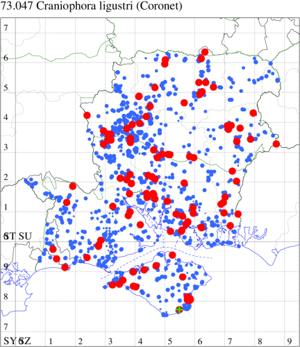 VC11: New Forest Wildlife Park, Ashurst, larva, present, field obs., , 27 Aug (iNat); Marchwood, one, 11 Jul; one, 25 Jun (CTha); Woodlands, NF, one, 30 Jun (RBW); Romsey, one, 09 May (MJB); Dibden Purlieu, one, 25 May; Dibden Purlieu, NF, one, 29 Jun; two, 30 Jun; one, 02 Jul; one, 11 Jul; two, 20 Jul (RAC); Hythe, larva, present, field obs., , 23 Aug (iNat); Blackfield, one, field obs., 08 Jul (SJJ); Swaythling, Southampton, two, 06 Jul (MEdg); Southampton, one, 25 Jun (MGP); Sholing, one, 03 Jun (ARC); West End, one, 10 Jul (AMD); Highbridge, Eastleigh, present, field obs., 06 Jul; Winchester, larva, present, field obs., , 12 Jul (iNat); Stubbington, one, 17 May; one, 29 Jun (DPH); Funtley, one, 01 Jul (TDC); Lee-on-Solent, one, 24 Jun; one, 26 Jun; one, 29 Jun (IHrg); Fareham, one, 29 Jun; one, 01 Jul; one, 18 Jul (ADT); one, 02 Jul (IMcP); one, 24 Jun; one, 29 Jun; one, 01 Jul (MLO); larva, present, field obs., , 23 Jul (FJon); Botley, one, 25 Jun; one, 13 Jun; one, 14 Jun; one, 21 Jun (SLB); Dean, Bishop's Waltham, present, 01 Aug (CMor); Waterlooville, one, 14 May; one, 21 Jun; two, 30 Jun; one, 02 Jul; six, 04 Jul (DWhe); Havant, one, 25 Jun (EJac); Langstone, one, 31 May (HuWhi); Emsworth, larva, present, field obs., , 19 Jul (iNat); Stroud, Petersfield, one, 29 Jun; present, 01 Jul; one, 10 Jul; one, 27 Jul (RAll); Petersfield, one, 30 Jul (CRoc); Christchurch: Cross Way, one, 16 Jun; one, 29 Jun (LPyk); Christchurch, one, 30 Jul (APard); Hengistbury Head NNR, one, 03 Jul; one, 04 Jul (BKin det. MJef); Burton, nr Christchurch, one, 07 Jul (JStw); Hengistbury Head, one, 26 Jun (MJef); New Milton, three, 29 Jun; one, 27 Jul (RPH); Sway, one, 10 Jul; one, 21 Jul (SKee); Pennington, one, 24 Jul (RFC);