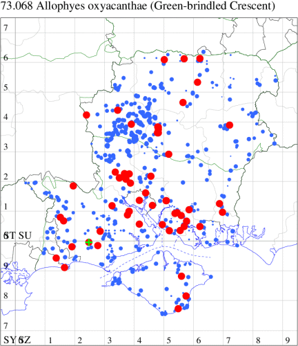 For the maps, all records prior to 2024 are shown by a blue dot (the larger the dot, the more recent), with the current year's records shown in red. As previous records are superimposed on any report for 2024, new sites have greater emphasis (i.e. will show as 'more red').