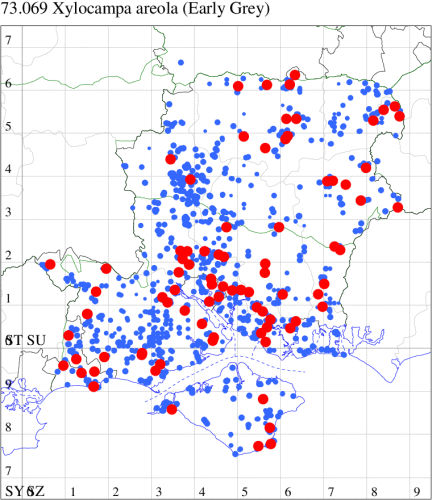 Common in broad-leaved woodland, gardens, and areas with scattered trees throughout England, a species of conservation concern under the UK Biodiversity Action Plan. In Hampshire and on the Isle of Wight widely distributed, but not particularly common. Wingspan 38-50 mm. No other similar species has such a late flight period. Larva feeds on Pedunculate Oak, Hawthorn, Blackthorn, Hazel, Goat Willow, Small-leaved Elm and Common Lime.