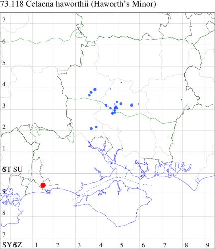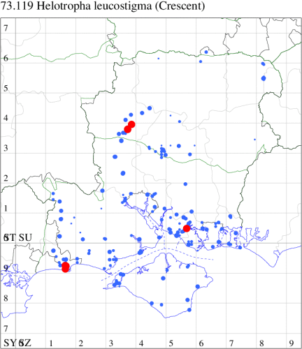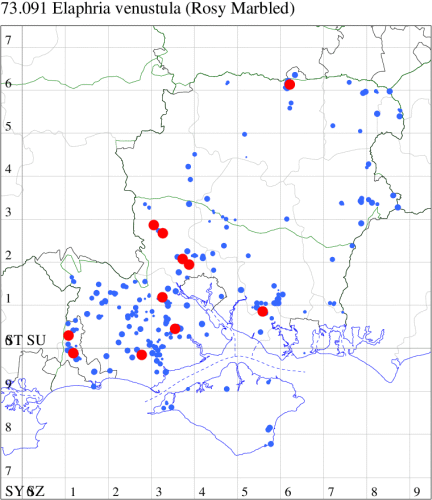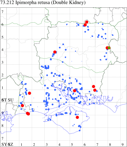 VC11: Marchwood, one, 19 Sep; one, 01 Sep; two, 06 Sep; one, 08 Sep (CTha); Woodlands, NF, one, 31 Aug (RBW); Lee, two, 06 Sep (CTha); Romsey, three, 01 Sep; five, 02 Sep; present, , 03 Sep (SRC); two, 30 Aug; three, 01 Sep; two, 03 Sep; one, 08 Sep; one, 16 Sep; one, 19 Sep (MJB); one, 01 Sep (NRJ); Stockbridge Down NT, one, 28 Aug (GCE); Dibden Purlieu, one, 28 Aug; Dibden Purlieu, NF, one, 01 Sep; one, 02 Sep; one, 07 Sep (RAC); Southampton, one, 19 Sep (MGP); West End, one, 01 Sep (AMD); Allbrook, two, 01 Sep; two, 02 Sep; one, 08 Sep; two, 20 Sep (SIng); Brownwich Cliffs, Titchfield, four, 06 Sep (F.M.G.); Funtley, four, 01 Sep (TDC); Fareham, one, 02 Sep; one, 08 Sep; one, 15 Sep (MLO); Botley, one, 01 Sep; one, 03 Sep; one, 13 Sep (SLB); Waterlooville, one, 08 Sep; seven, 06 Oct (DWhe); Northney, Hayling Island, present, 02 Sep; present, 13 Sep (JWP); Hurn, two, 11 Sep (MJef); Sway, one, 26 Aug; three, 01 Sep; one, 03 Sep; one, 08 Sep; two, 09 Sep (SKee); Sway, NF, present, 01 Sep (DMui); Pennington, one, 31 Aug; one, 06 Sep; two, 07 Sep; one, 20 Sep; one, 22 Sep (RFC);