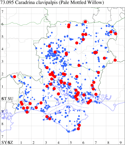 A common migrant from mainland Europe, appearing most frequently in southern coastal counties, less often inland and northwards to southern Scotland and the Inner Hebrides; recorded throughout Hampshire and the Isle of Wight. Wingspan 26-32 mm. The main confusion species are Pale Mottled Willow Paradrina clavipalpis and the rare migrant Dark Mottled Willow S. cilium, but combination of resting position, in which forewings are wrapped tightly around the body, and brownish centres to reniform and orbicular stigmata usually diagnostic. Larva feeds on Dandelion, Groundsel, Broad-leaved Dock, Curled Dock and Common Restharrow.