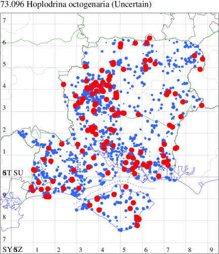Common in a wide range of habitats, mainly in low-lying areas, including woodland, rough meadows and gardens throughout the British Isles. Widespread and common in Hampshire and on the Isle of Wight. Wingspan 31-33 mm. Easily and frequently confused with Rustic H. blanda, but generally H. octogenaria has broader and rougher forewing, stigmata contrasting with remainder of forewing, and more conspicuous cross-lines (MBGBI Vol 10). The general coloration of The Rustic is brown to grey with a glossy appearance, whereas The Uncertain is ochreous brown and coarser looking, and the orbicular stigma is usually smaller in The Rustic. The hindwings are greyer and glossier in The Rustic and the stigma smaller than The Uncertain. The Uncertain flies from late May, whereas The Rustic usually appears at the end of June. See the comparison photo in the collection above.