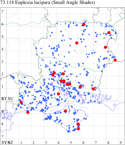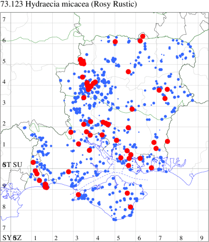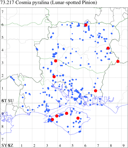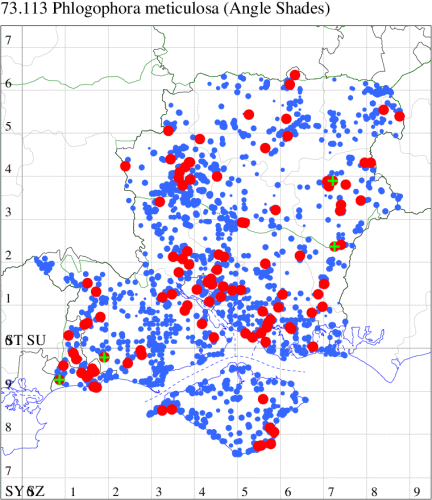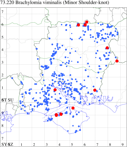 VC11: Stubbington, one, 30 Jun (WMay); Lee-on-Solent, one, 29 Jun (IHrg); Fareham, one, 27 Jun; one, 29 Jun; one, 01 Jul (ADT); one, 25 Jun (IMcP); Botley, one, 25 Jun (SLB); Christchurch: Cross Way, one, 20 Jul (LPyk); Hengistbury Head NNR, one, 27 Jun (MoTay det. MJef); two, 04 Jul (BKin det. MJef); one, 10 Jul (HengistH det. MJef); two, 11 Jul; one, 14 Jul (BKin det. MJef); one, 16 Jul (HengistH det. MJef);