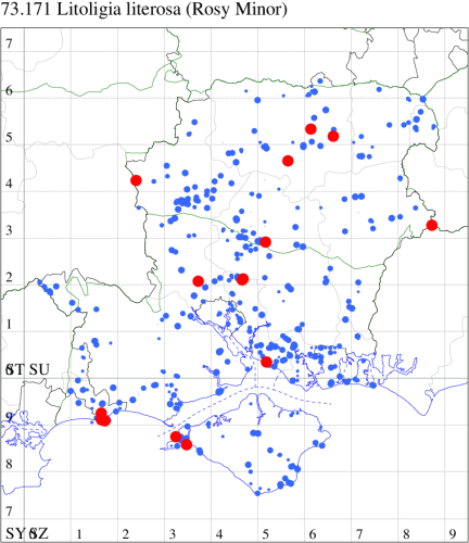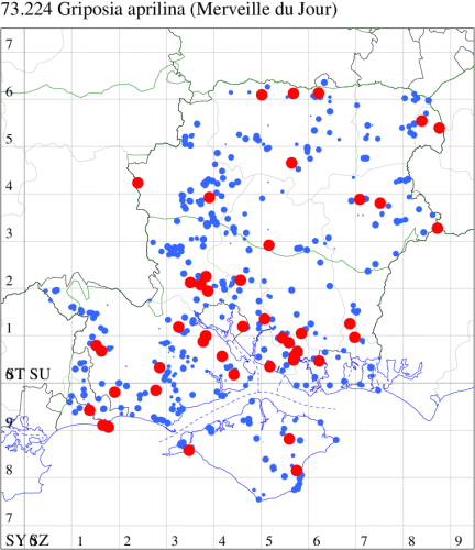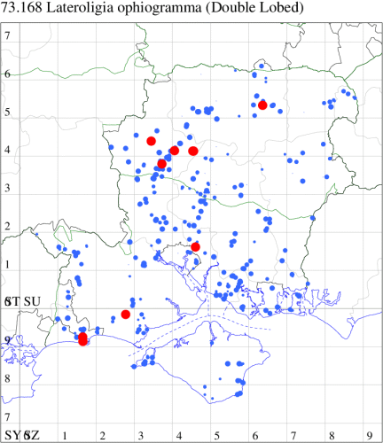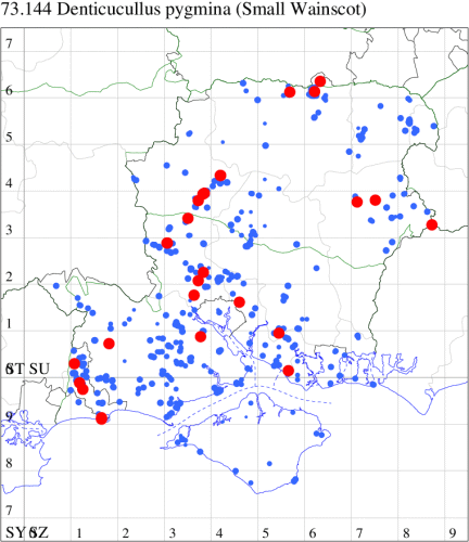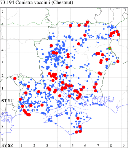 For the maps, all records prior to 2024 are shown by a blue dot (the larger the dot, the more recent), with the current year's records shown in red. As previous records are superimposed on any report for 2024, new sites have greater emphasis (i.e. will show as 'more red').