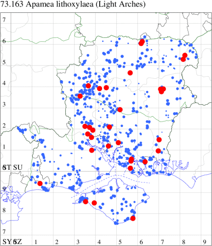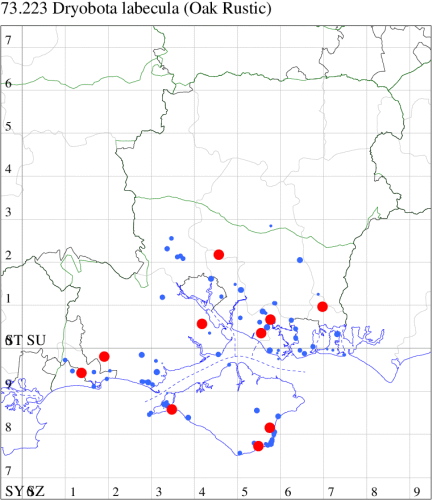 This species was found in Jersey in 1991 and is now established on Evergreen (Holm) Oak in the Channel Islands. First recorded in Britain at Freshwater, Isle of Wight, on 15 October 1999, and now annual in Freshwater and Ventnor in reasonable numbers, although only one confirmed larval record exists, from Fort Victoria in 2006; subsequently appearing in mainland Hampshire on 15 October 2005, and increasingly thereafter along the south coast: there have been two larval records to 2015. Wingspan 30-32 mm. The main confusion species are certain forms of Common Rustic Mesapamea secalis and Lesser Common Rustic Mesapamea didyma, but Oak Rustic usually has orange (occasionally white) reniform stigmata and flies very late in the season.