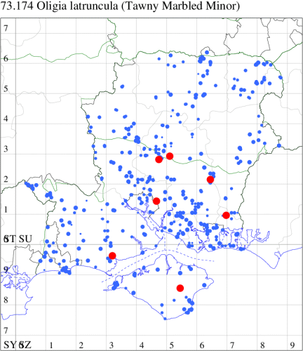 VC10: Ningwood Common, present, 25 Jun; present, 02 Jul; present, 07 Jun; present, 17 Jun; present, 20 Jun; present, 25 Jun; present, 02 Jul; present, 17 Jun; present, 25 Jun; present, 02 Jul (HMak); Speedwell, Cranmore, NF, present, several, 18 Jun (AMD); Newtown, four, 26 Jun; Walter's Copse, Newtown, one, 26 Jun (PBard); Osborne Wood, one, 01 Jul (IOu);