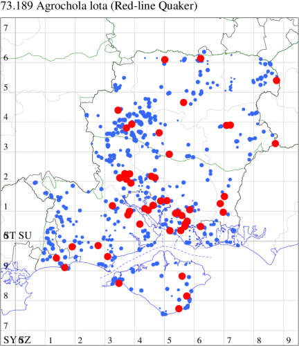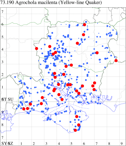 Local in gardens, waste ground, damp meadows and rough ground throughout much of southern England and Wales. In Hampshire previously very local and by no means common, except in the Alton/Selborne area, but in recent years has become a relatively common autumn moth, perhaps indicating a recent range expansion and growth in population. On the Isle of Wight, remains extremely uncommon. Wingspan 42-52 mm. Larva feeds on Dandelion, Rosebay Willowherb, Red Valerian and Common Ragwort, over-wintering as an egg.