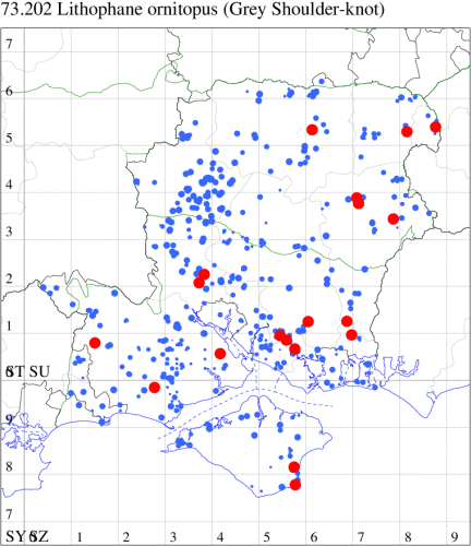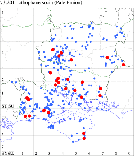 VC11: Dibden Purlieu, NF, one, 08 Sep; one, 09 Sep; Dibden Purlieu, one, 12 Oct; one, 13 Oct; one, 14 Oct; one, 15 Oct; one, 15 Oct; one, 16 Oct; one, 17 Oct (RAC); Blackfied, one, to lighted window, male, 30 Sep (PGS); Sholing, one, 06 Oct (ARC); Stubbington, one, 20 Sep; two, 04 Oct; one, 19 Oct (DPH); Funtley, one, 16 Oct (TDC); Fareham, one, 04 Oct; one, male, 25 Oct; one, male, 29 Oct (ADT); four, 15 Oct (IMcP); one, 28 Sep; one, 02 Oct; one, 10 Oct; three, 12 Oct; four, 17 Oct (MLO); Botley, one, 11 Oct; one, 15 Oct (SLB); Portchester, one, 02 Oct; one, 04 Oct; three, 10 Oct; one, 11 Oct; three, 12 Oct; one, 21 Oct (CEH, JGS); one, 09 Oct; one, 17 Oct; one, 21 Oct (DH-J); Portsmouth, one, 24 Oct (IRT); Waterlooville, one, 16 Oct (DWhe); Northney, Hayling Island, present, 31 Oct (JWP); Christchurch: Cross Way, one, 15 Oct (LPyk); Hengistbury Head NNR, one, 16 Sep; one, 18 Sep; one, 04 Oct (HengistH det. RPH); Pennington, one, 13 Oct (RFC)