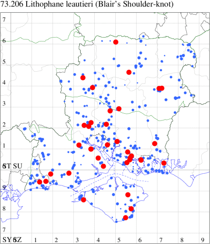 Common in damp woodland, marshes, fens and gardens throughout the British Isles, a species of conservation concern under the UK Biodiversity Action Plan;. Well distributed across much of Hampshire and on the Isle of Wight. Wingspan 29-35 mm. Potential confusion species all lack basal streak on forewing and emerge earlier in the year. Larva feeds on most species of Sallow, amongst which the larvae are often common in the spun shoots, over-wintering as an egg.